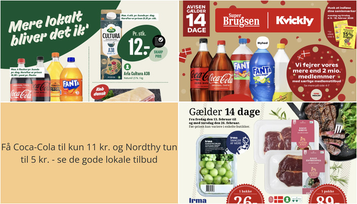SuperBrugsen tilbyder Coca-Cola, Fanta eller Schweppes i flere varianter (125-150 cl) til en pris på kun 11 kr. pr. flaske. Dette tilbud gælder fra fredag den 6. februar til og med torsdag den 19. februar 2026.